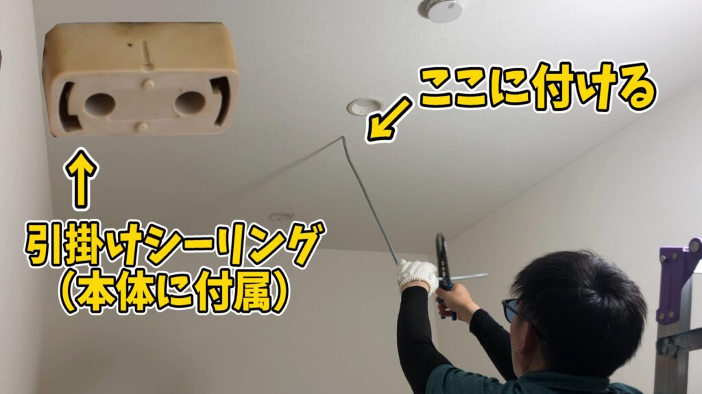 前工程で取り付けた下地材に電線を通してシーリングライトを取り付ける「引掛けシーリング」を取り付けます。