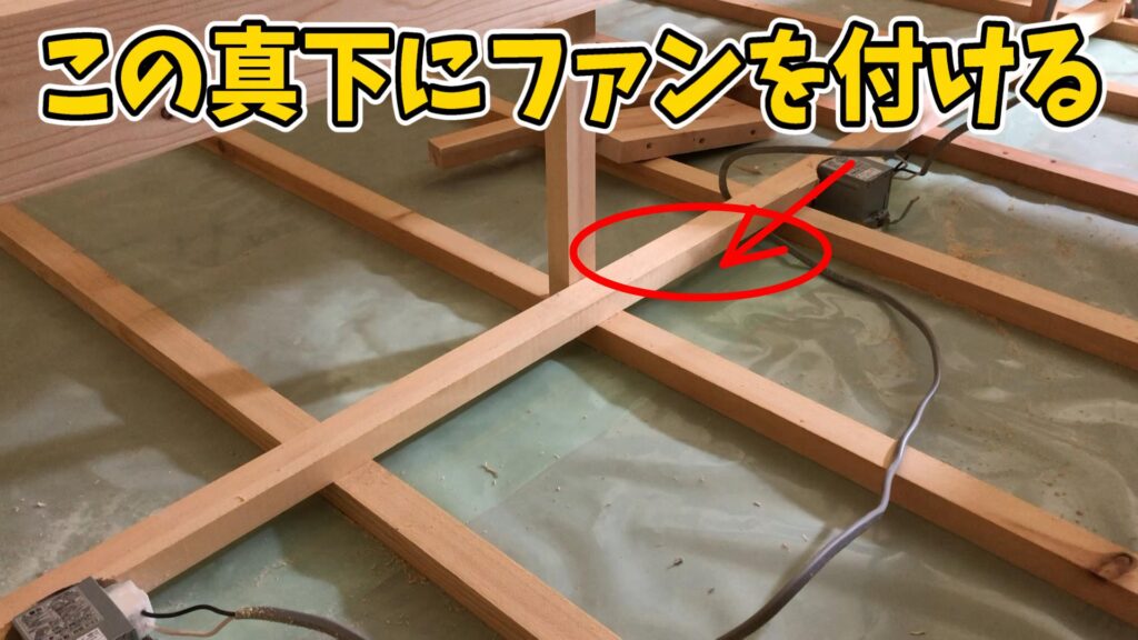 写真の赤丸の真下にファンが取りつくので、見えている木材と木材の間に下地を入れてしっかりと固定します。