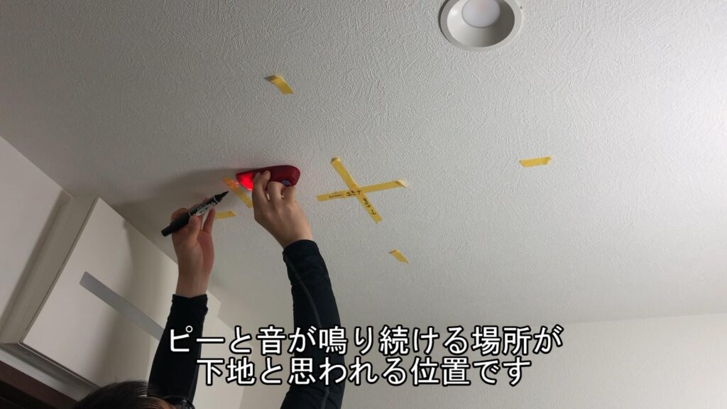 下地センサーは壁(天井)に押し付けてからボタンを押してそのまま横移動します。すると下地がある場所に差し掛かると音と光(矢印が出る)で教えてくれるのでマジックで印をしておきます。