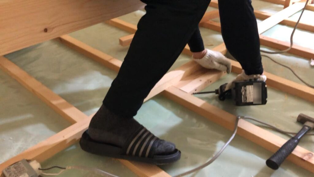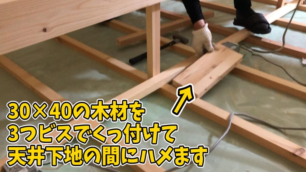 天井下地の間の寸法に切った物をハンマーではめ込みスリムビスで沢山止めます。