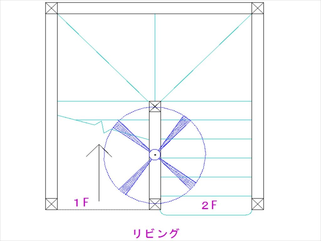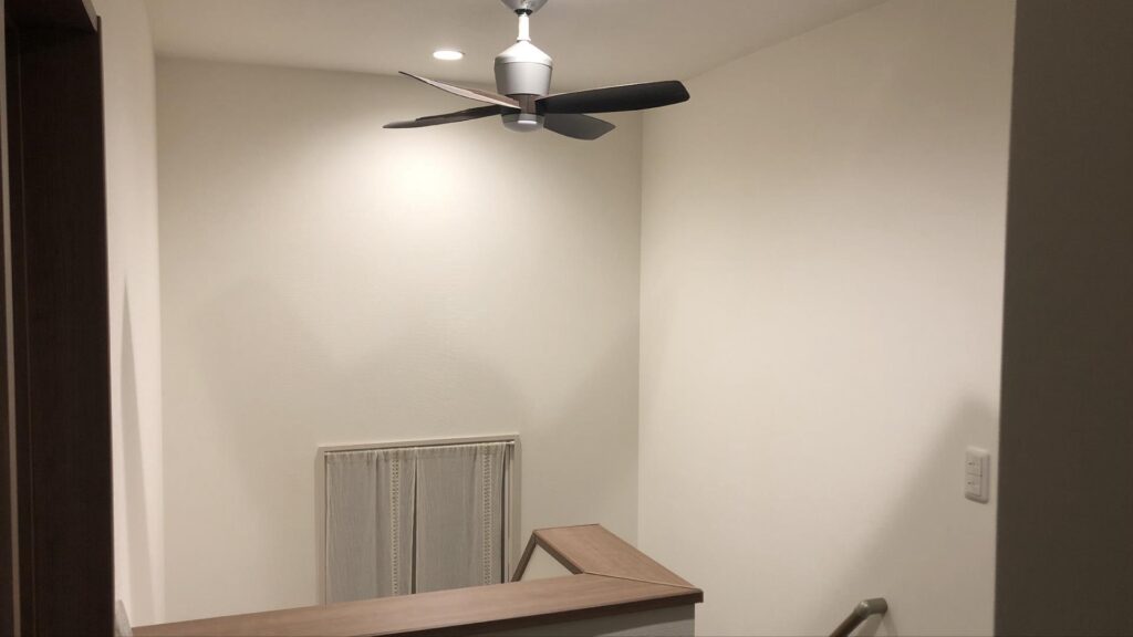 今回は家の1階と2階の温度差を少なくすべくリビング階段の上にシーリングファンを取り付けました。