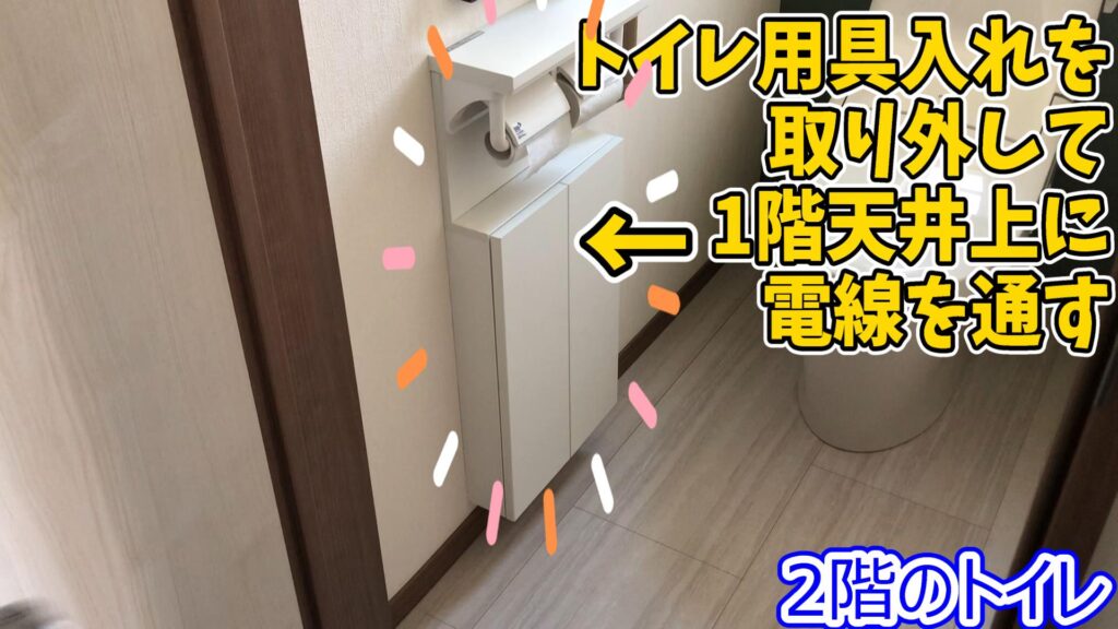 天井裏から電気を1階まで通すのに良いスペースが無かったので、トイレの収納を一度取り外し、見えるようになった梁に斜めに穴を開けて一階の天井裏に通す事にしました!!