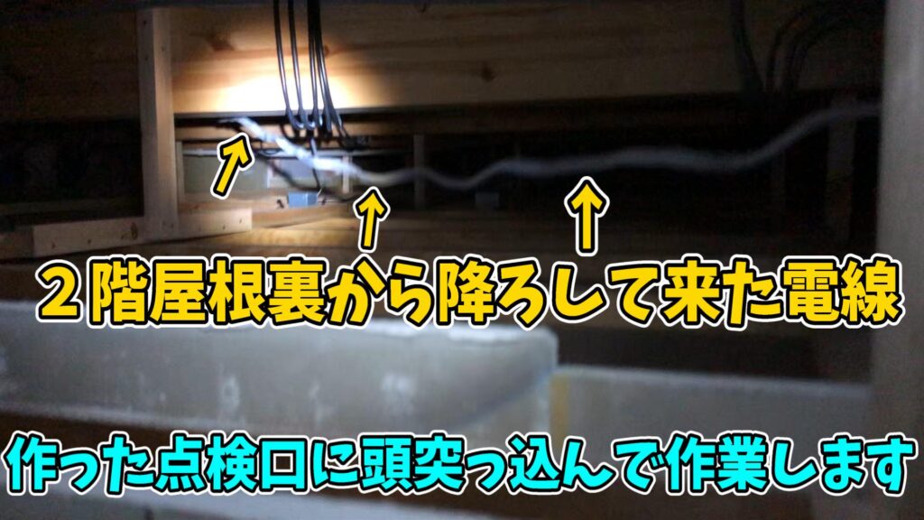 2階屋根裏に登り、先ほどの収納部分(穴開けた所)目掛けて電線を降ろします。