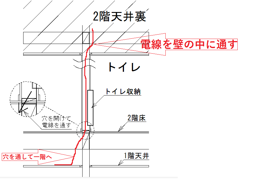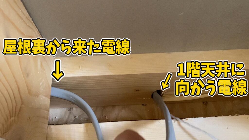 2階屋根裏から来た電線を先ほど開けた穴に通して一階天井へ送り込みます。